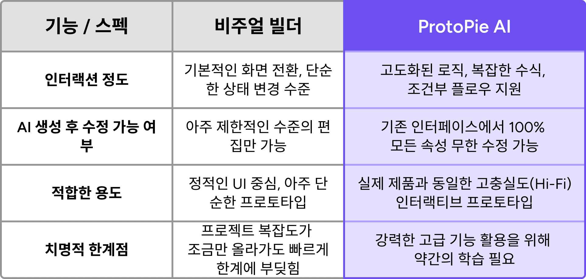 ProtoPie AI vs 비주얼 빌더 (예: Figma AI, Framer AI 등)