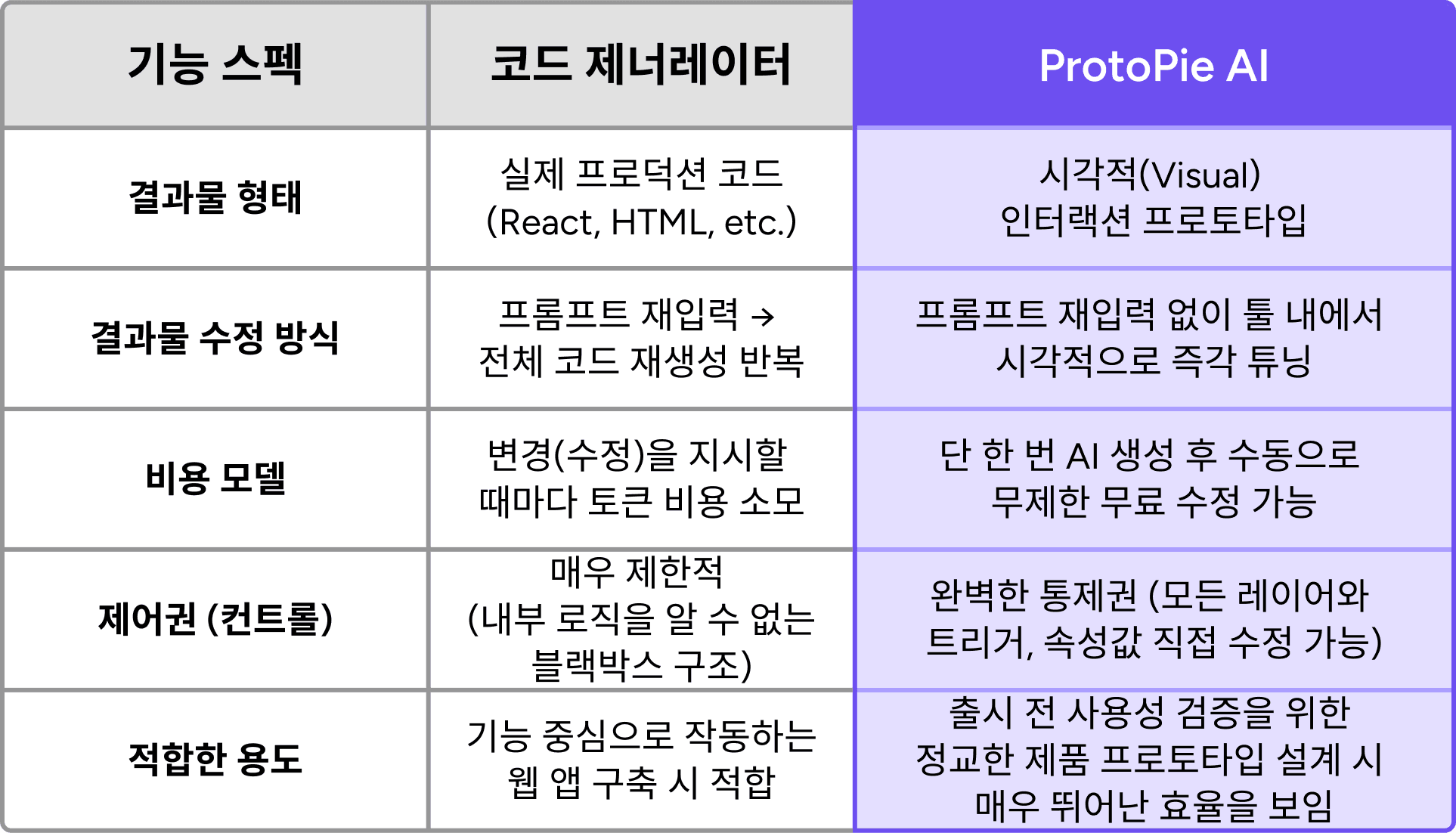 ProtoPie AI vs 코드 생성기 (Cursor, v0 등)