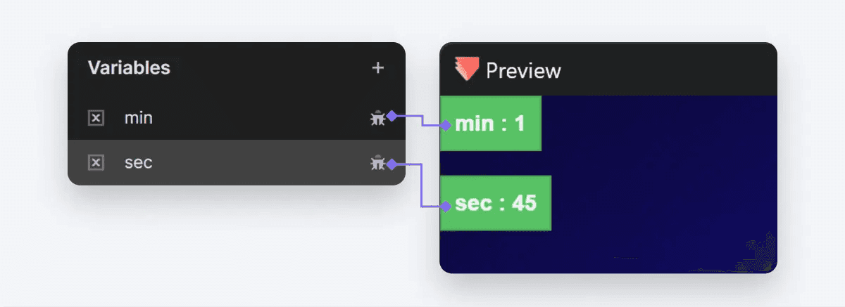 원하는 시간 형식을 얻으려면 특별히 이 장면(scene)에 대한 두 가지 베리어블을 생성합니다. 한 베리어블인 min은 형식화된 시간의 분 단위를 나타내며, 다른 베리어블인 sec는 초 단위로 표시됩니다.