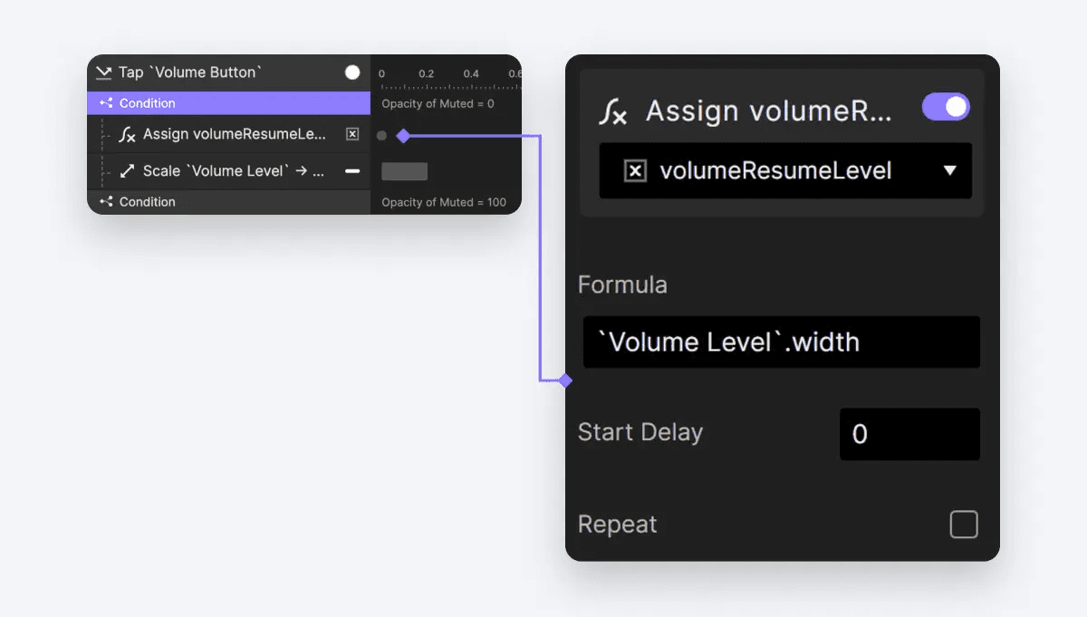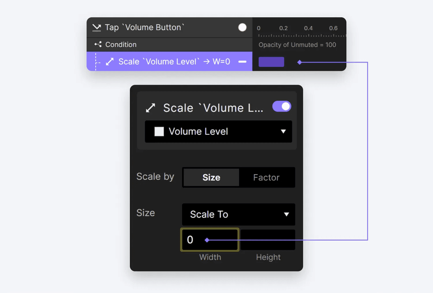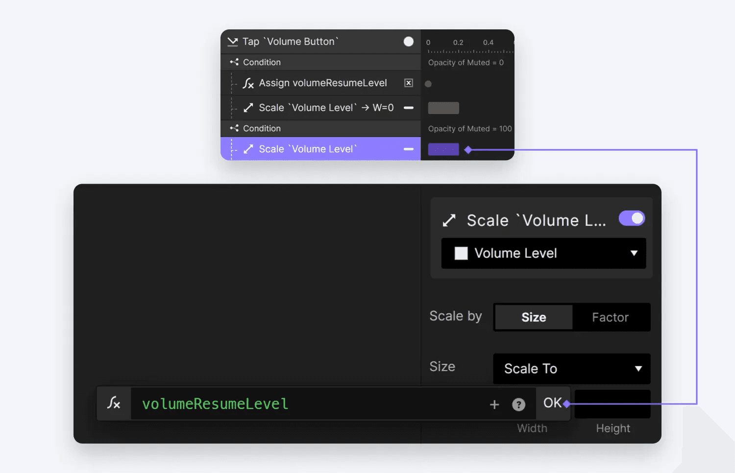 Opacity of Muted = 100)에 이어 이제 볼륨 레벨 레이어에 스케일 동작을 구현할 수 있습니다. 이 동작은 레이어를volumeResumeLevel에 저장된 값으로 확장하여 볼륨이 음소거되기 전의 원래 레벨로 효과적으로 복원합니다.