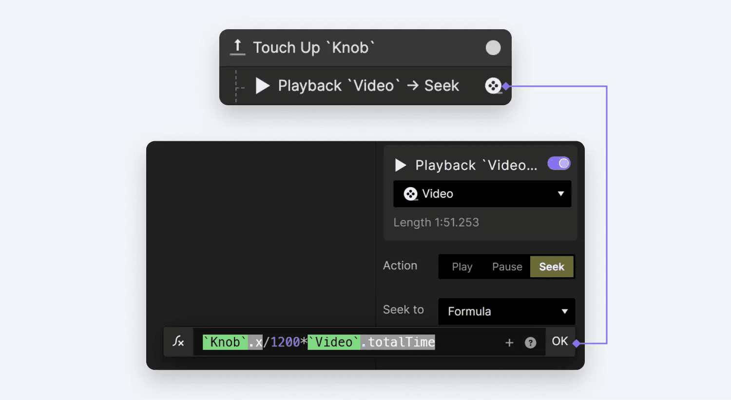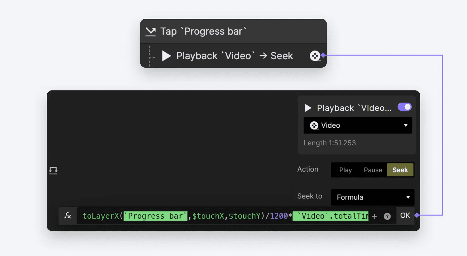 Touch Up 동작의 경우 Video 레이어에 대한 Playback 리스폰스를 설정합니다. Playback 리스폰스에서 Seek 옵션을 선택하면 formula를 사용할 수 있습니다: