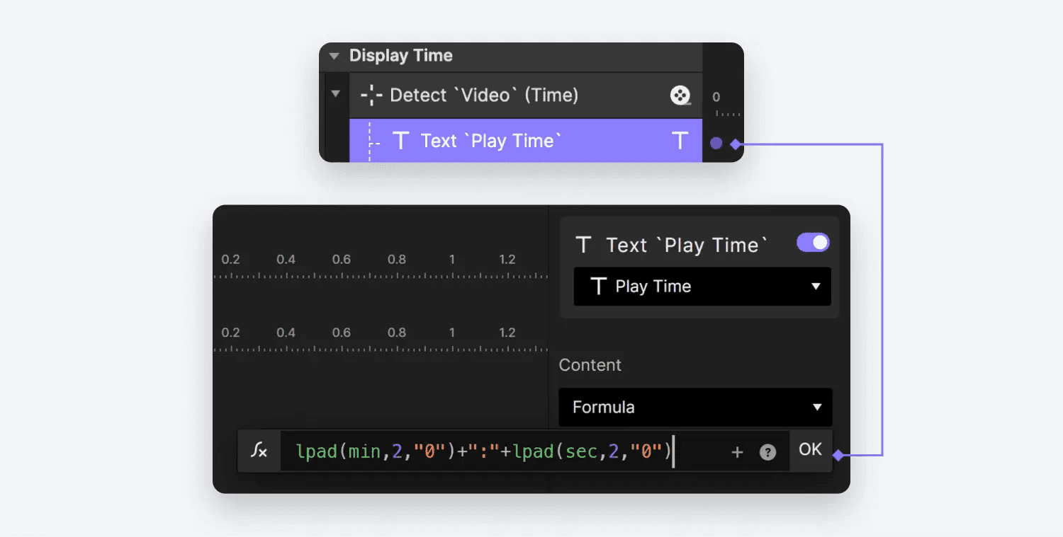 다음으로 Play Time 레이어에 텍스트 리스폰스를 할당합니다. 이 리스폰스에는 Formula를 사용합니다. 사용할 공식은 'Video'.currentTime입니다. 이렇게 하면 레이어가 동영상의 현재 재생 시간을 정확하게 반영할 수 있습니다.