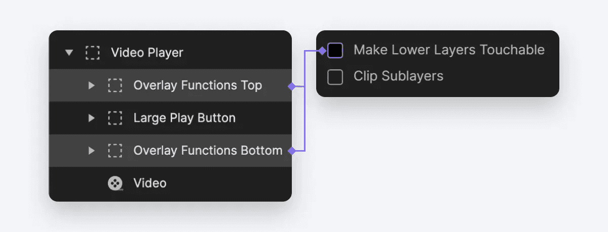 그렇게 하려면 두 그룹 Overlay Function Top 및 Overlay Function Bottom을 모두 선택하고 속성 패널에서 Make Lower Layers Touchable 옵션을 비활성화합니다.