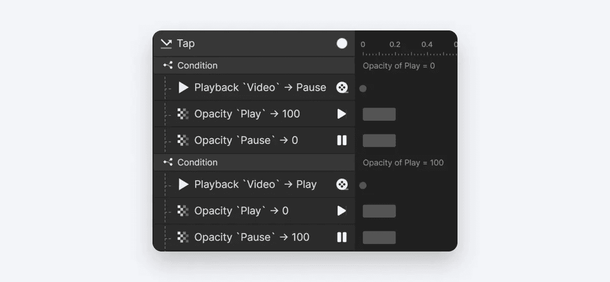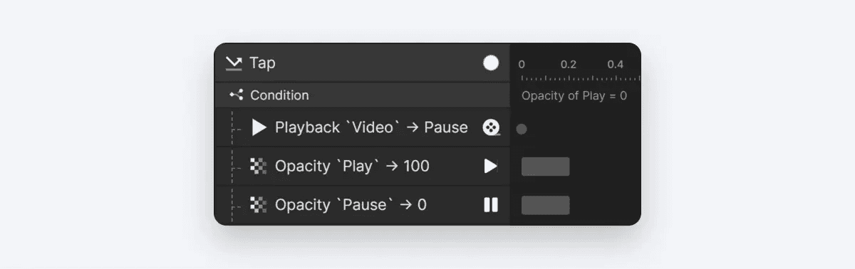 먼저 재생/일시 정지 그룹에 탭 트리거를 추가합니다. 그런 다음 Play 아이콘의 불투명도가 0과 같음을 기준으로 조건을 생성합니다. 이 조건 아래에서는 동영상 레이어에 Playback 리스폰스를 추가하여 일시 정지합니다.