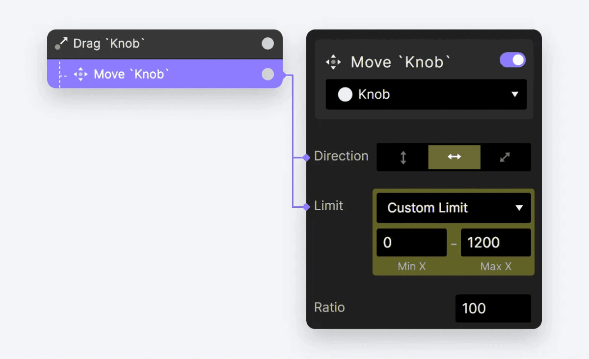 Drag 인터랙션 아래에서 노브에 대한 Move 동작을 구성합니다. 이 Move 동작의 경우 노브의 이동을 수평 방향으로만 제한합니다. 또한 노브가 진행 표시줄 밖으로 나가지 않도록 제한을 설정합니다. 특히 제한은 0px에서 1200px까지이며, 진행 표시줄의 범위 내에 유지됩니다.