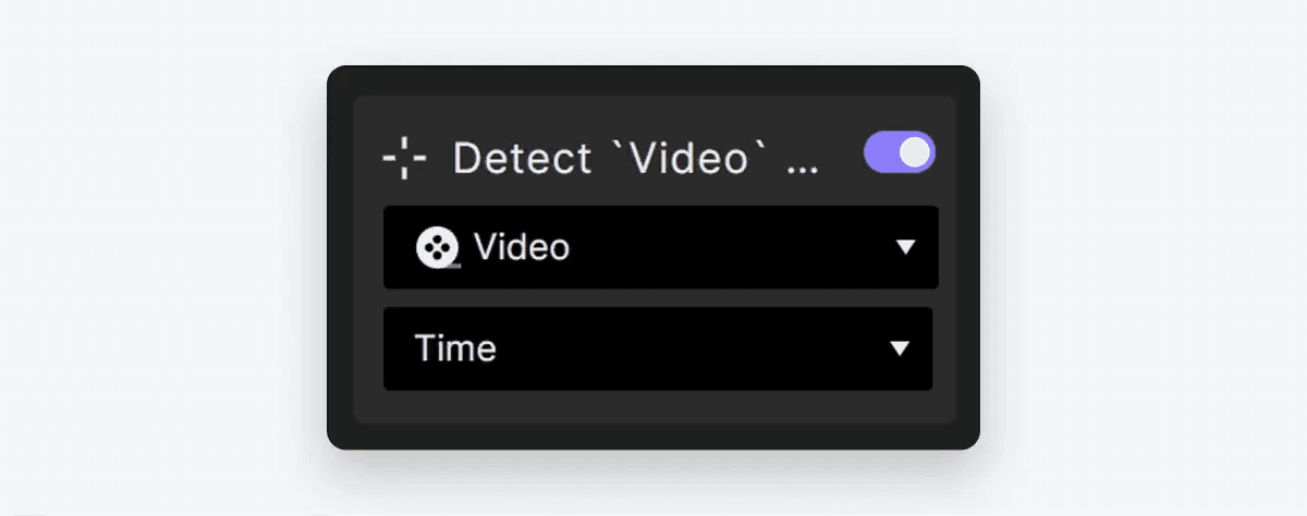 먼저 Detect 트리거를 추가합니다. 트리거의 경우 Video 레이어의 Time 속성을 선택합니다. 이 설정은 비디오의 현재 재생 시간의 변경 사항을 지속적으로 모니터링하고 변경 사항이 발생하면 그에 따라 인터랙션을 트리거합니다.