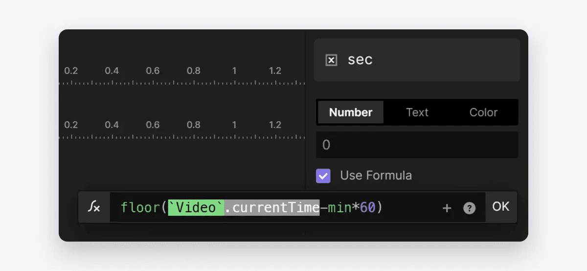 floor('Video'.currentTime-min*60)를 사용합니다. 이 formula는 동영상의 현재 재생 시간에서 분(이전에 최소 변수로 계산)에 60을 곱한 값을 빼고 반올림하여 초 단위 자리를 계산합니다.