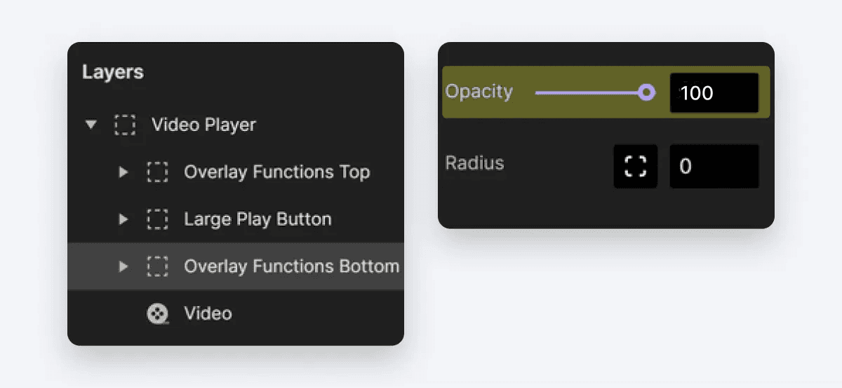 몇 가지 마무리 작업을 추가합니다. 레이어 패널에 Large Play Button이라는 그룹이 표시됩니다. 동영상이 일시 정지된 후 동영상이 재생 중일 때 숨길 수 있도록 합니다. Opacity 리스폰스를 활용하여 동영상이 표시될 때와 숨길 때를 제어할 수 있습니다.