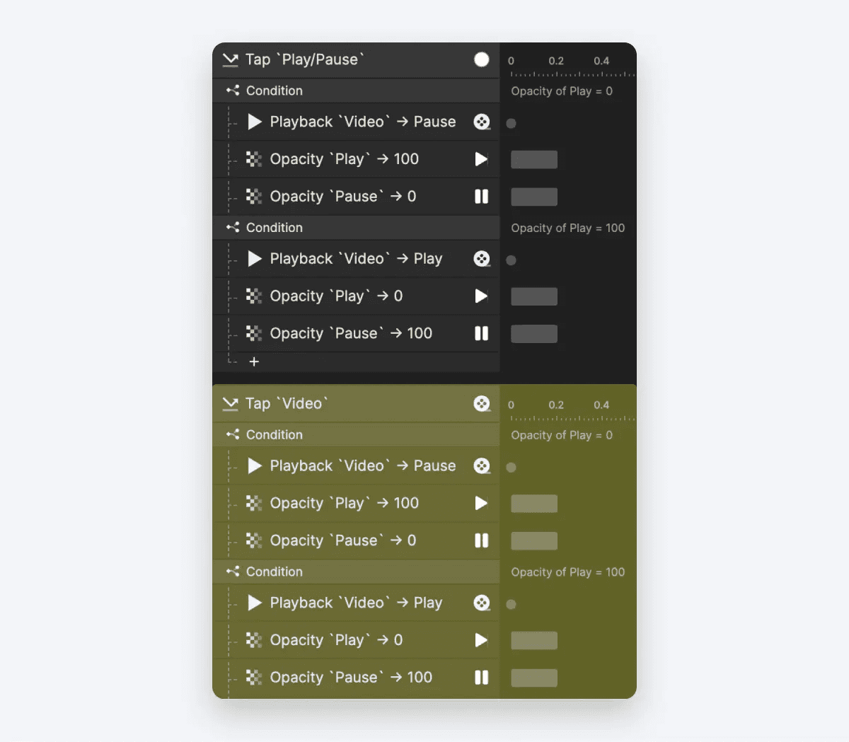 두 번째 조건에서는 Play의 불투명도를 100으로 설정합니다. 후속 리스폰스는 동영상을 재생하면서 재생 아이콘의 불투명도를 0으로 변경하고, Pause 아이콘의 불투명도를 100으로 변경하는 것입니다.