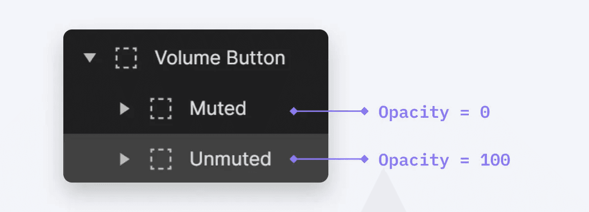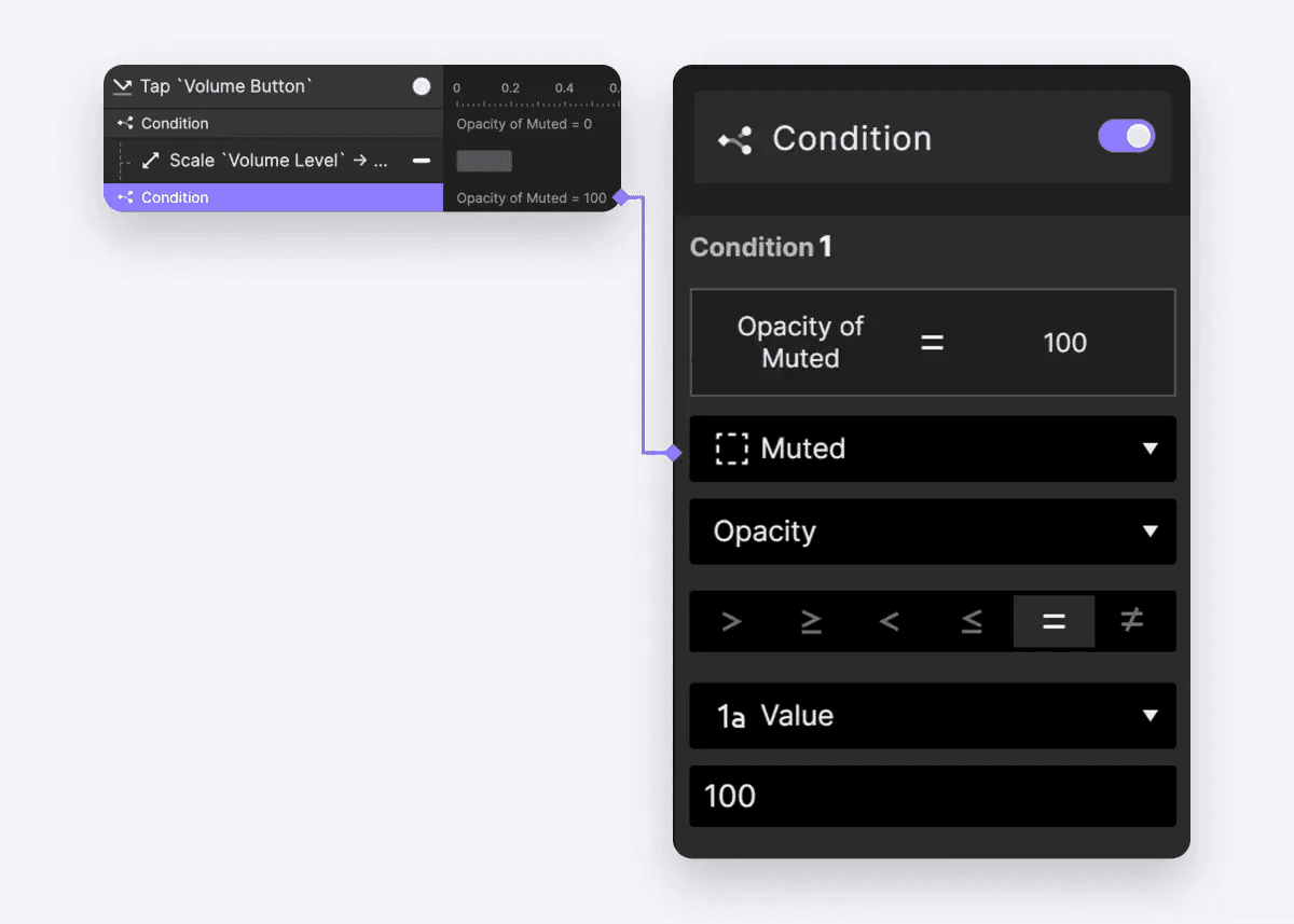 Muted 그룹의 불투명도가 100인 경우에 대한 추가 조건을 생성하여 동영상이 음소거되었음을 나타냅니다. 이 조건에서는 Volume Leve 레이어의 너비가 동영상이 음소거되기 전의 이전 상태로 돌아가도록 구성합니다.