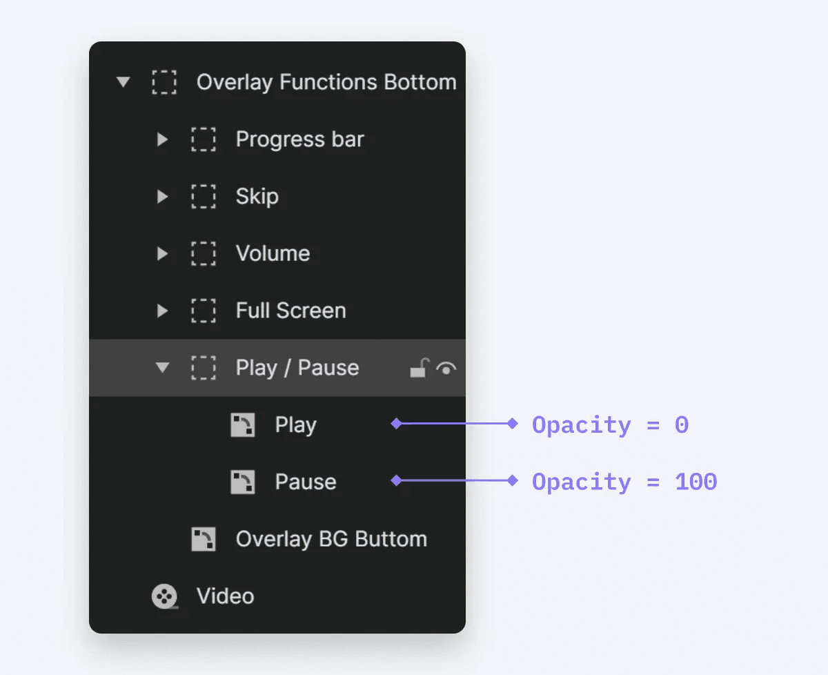 동시에 아이콘도 전환해야 합니다. Play 아이콘의 경우 불투명도를 100으로 설정하고 Pause 아이콘의 경우 불투명도를 0으로 설정합니다.