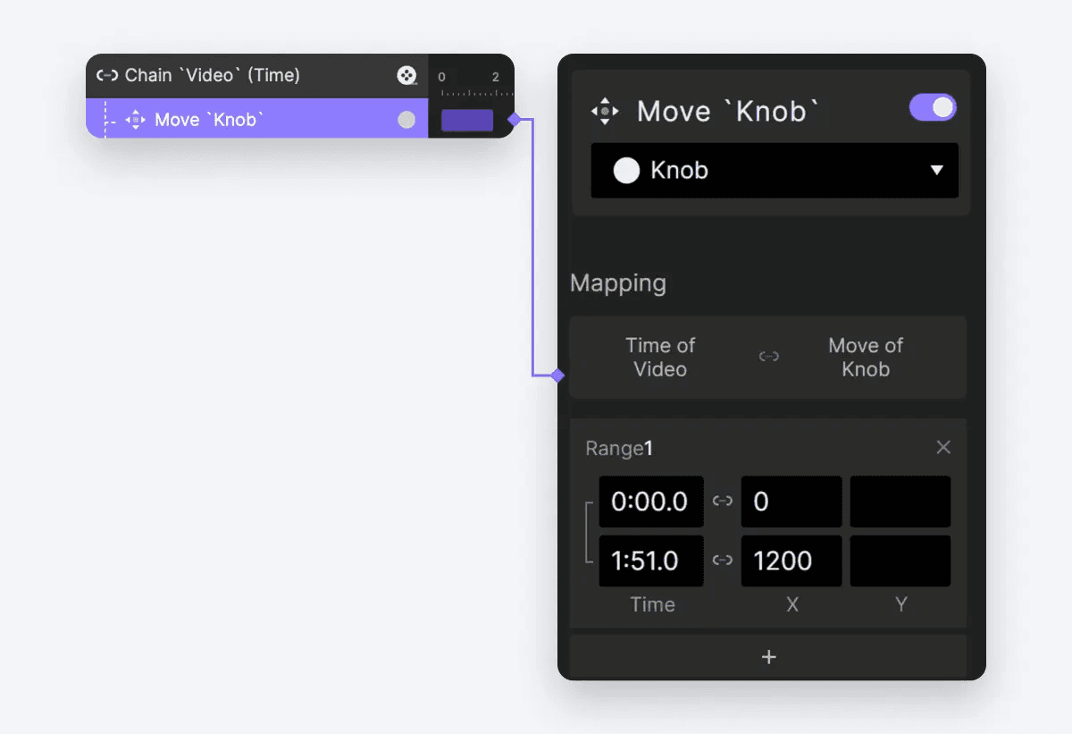 Drag 동작을 완료하고 마우스를 놓으면 노브가 드래그된 현재 지점까지 동영상의 진행 상황을 확인할 수 있습니다. 이제 Knob 레이어에 Touch Up 트리거를 추가합니다.