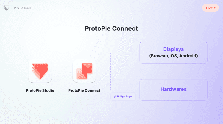 ProtoPie는 다양한 디스플레이를 위해 코딩 없이 하이파이 인터랙션을 만드는 프로토타이핑 툴입니다. ProtoPie Connect는 ProtoPie의 기능을 확장하여 외부 데이터와 상호작용하고 하드웨어와 통합할 수 있는 기능을 제공합니다.