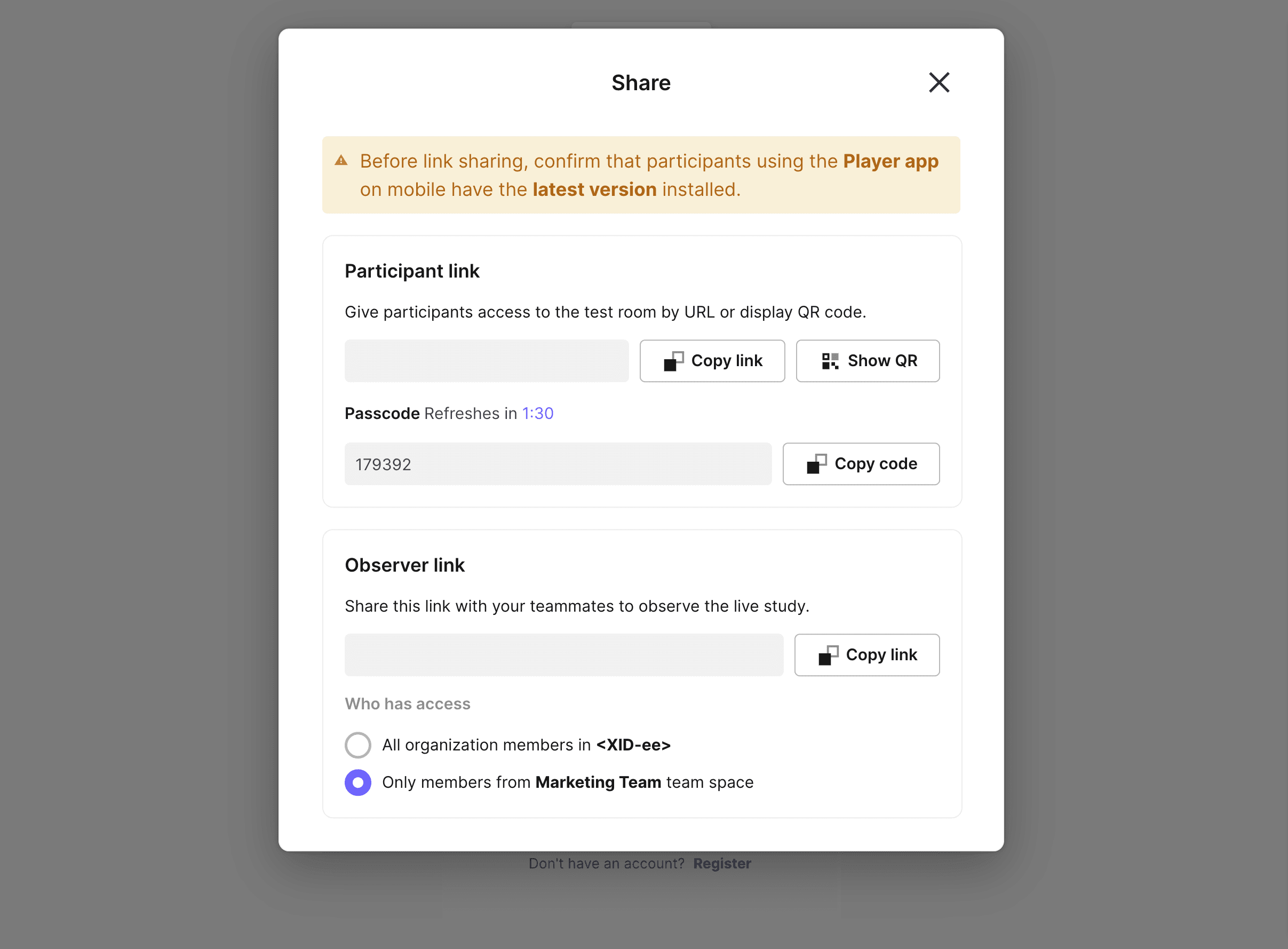 나머지 팀원들(디자이너, 개발자, 이해관계자 등)은 유료 시트 없이 무료 참관자(옵저버/Observer) 자격으로 참여하여 세션을 실시간으로 참관할 수 있습니다. 접근 권한은 조직 전체 또는 특정 팀 스페이스로 컨트롤할 수 있습니다.